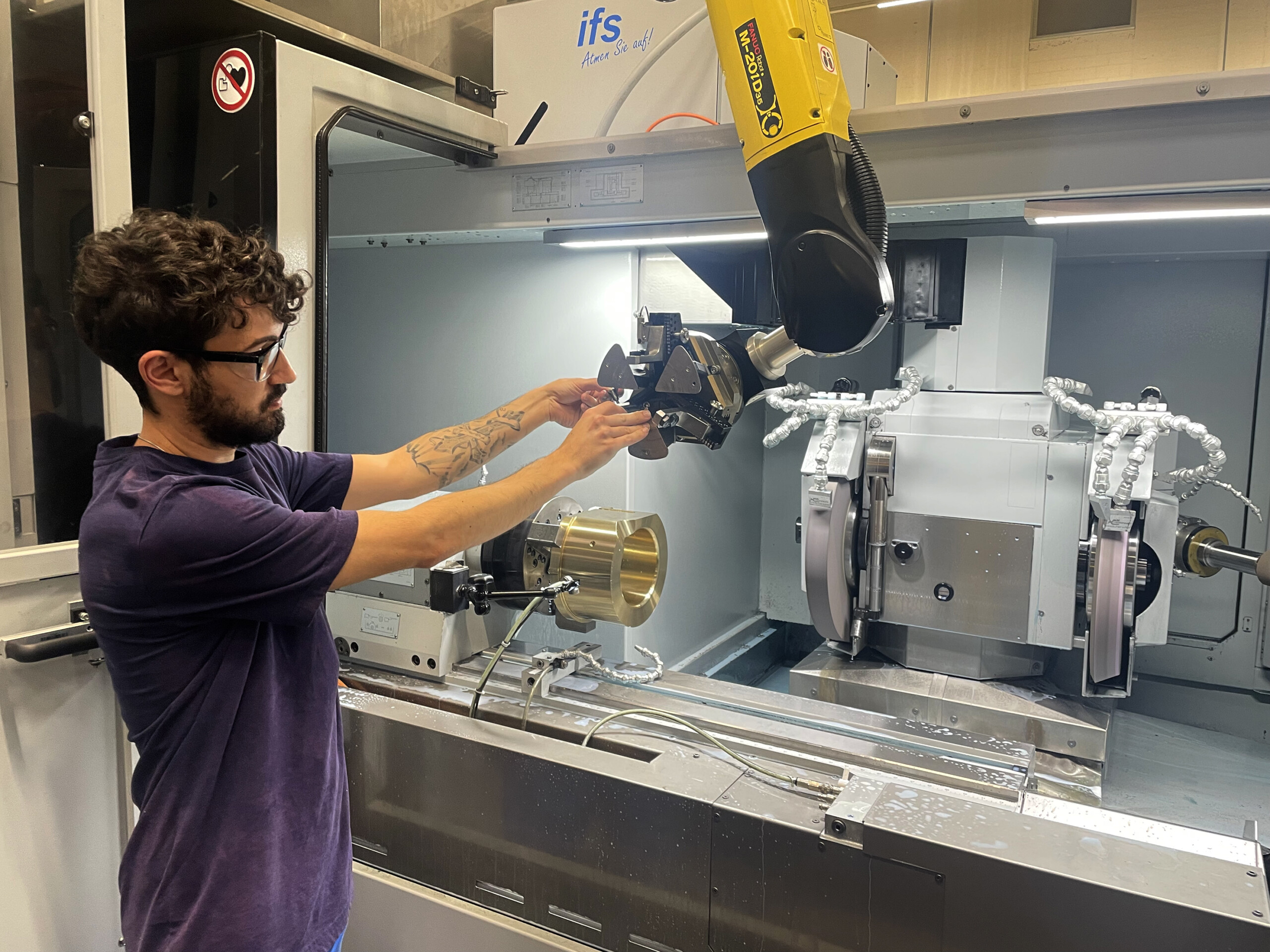 The robot has a 3-jaw chuck for the safe transportation of the workpieces. The processing time for this aluminum bronze workpiece is between 45 minutes and one and a half hours.