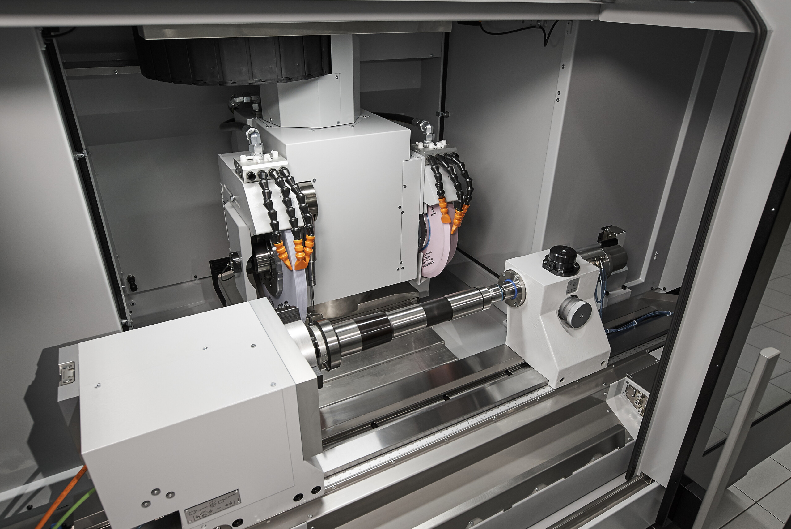 Key features include a compact grinding head with 10 variants, offering 11.5 kW drive power and a 500 mm grinding wheel with speeds of up to 63 m/s. Moreover, the machine includes a collision-free universal head with three tool positions and one measuring position. The newly designed measuring probe arrangement eliminates the swivel mechanism, thereby improving measuring accuracy. In addition, the synchronous tailstock allows for complete machining of shafts without a driver, enabling workpieces to be fully processed over their entire length.