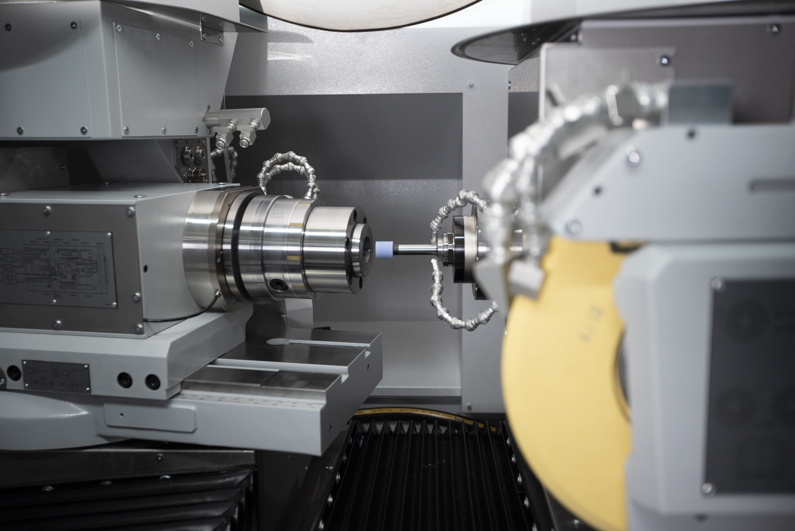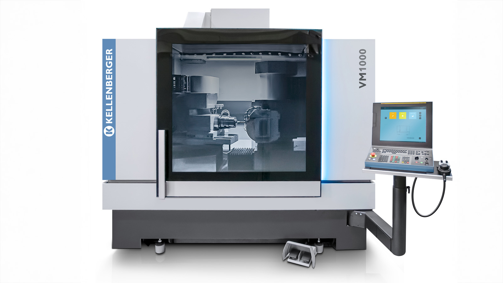 The kinematically flexible machine design of the KELLENBERGER VM1000 has two linear axes and two rotary axes. The hydrostatic linear axes with newly developed HYDROLIN® guides are backlash-free for positioning accuracies in the nanometer range. The high-precision hydrostatic B-axes also perform all necessary movements of the dressing and measuring devices. This flexibility makes a large number of machining variants possible and shortens set-up times. The spindle turret on the B1 axis is equipped with a uniquely compact grinding spindle head with a flexible internal grinding spindle arrangement for a maximum of four grinding spindles.